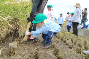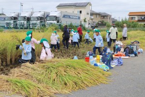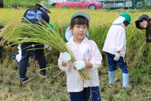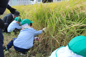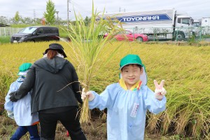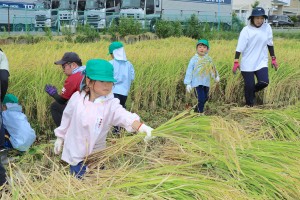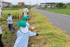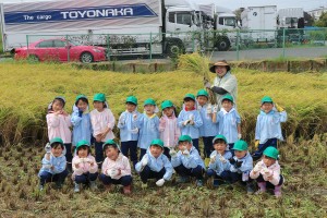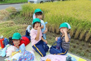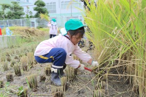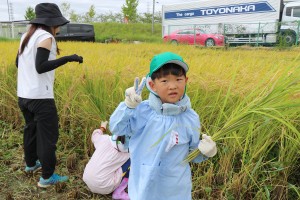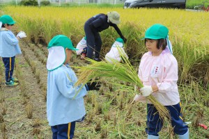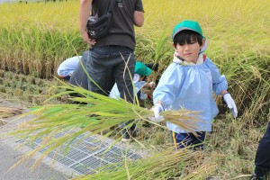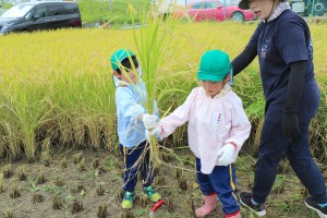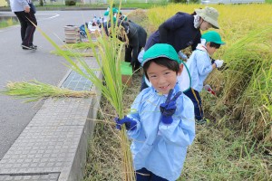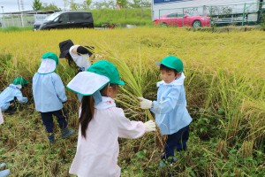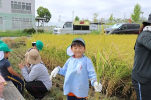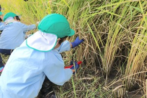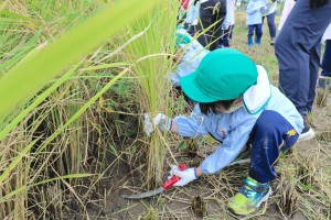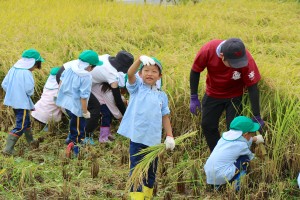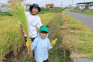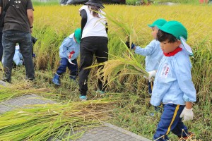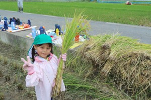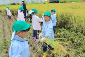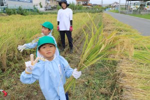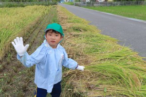 怪我もなく慣れない鎌を使って上手に稲刈りが出来ました。来月には今日収穫したお米をおにぎりにして、幼稚園のみんなで美味しくいただきたいと思います。
