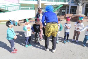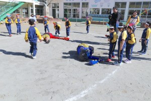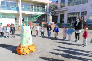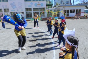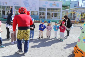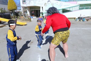 年少・年中組はやさしい先生の鬼、年長組は姿を明かさぬ怖いバージョンの鬼に